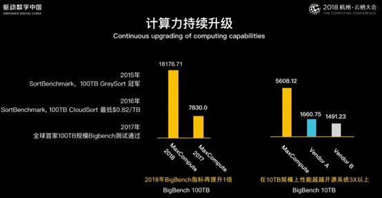 2018年9月云栖大会发布,MaxCompute 在标准测试集 TPC-BB 100TB整体指标较2017年提升一倍以上。