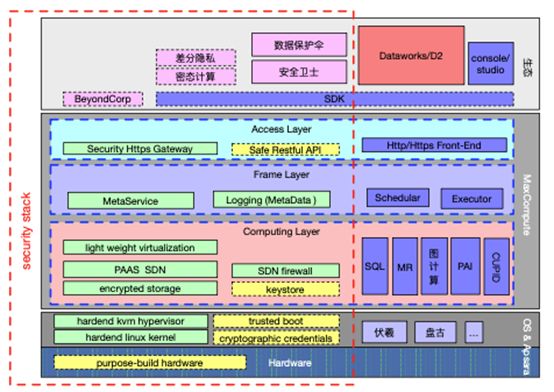 结合MaxCompute元仓(MetaData)提供的安全审计能力和元数据管理(MetaService)提供的安全授权鉴权能力,以及数据安全生态中安全卫士和数据保护伞等安全产品,就构成了 MaxCompute安全栈完整大图。