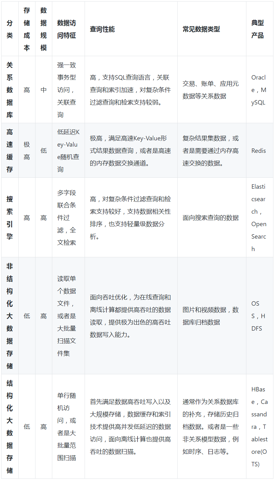 主存储:数据产生自业务或者是计算,通常为数据首先落地的存储。ACID等事务特性可能是强需求,提供在线应用所需的低延迟业务数据查询。