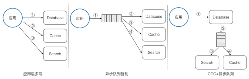 CDC(Change Data Capture)技术:这种架构下数据写入主存储后会由主存储再向辅存储进行同步,对应用层是最友好的,只需要与主存储打交道。主存储到辅存储的数据同步,则可以再利用异步队列复制技术来做。不过这种方案对主存储的能力有很高的要求,必须要求主存储能支持CDC技术。一个典型的例子就是MySQL+Elasticsearch的组合架构,Elasticsearch的数据通过MySQL的binlog来同步,binlog就是MySQL的CDC技术。