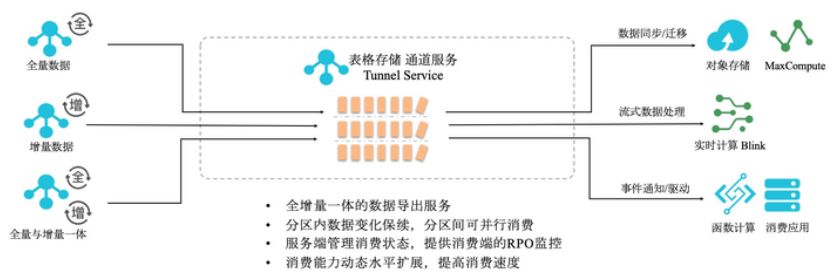 通道服务是Tablestore的CDC技术,是支撑数据派生体系的核心功能,具体能力可参考这篇文章。能够被利用在异构存储间的数据同步、事件驱动编程、表增量数据实时订阅以及流计算场景。目前在云上Tablestore与Blink能无缝对接,也是唯一一个能直接作为Blink的stream source的结构化大数据存储。