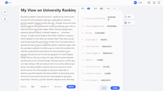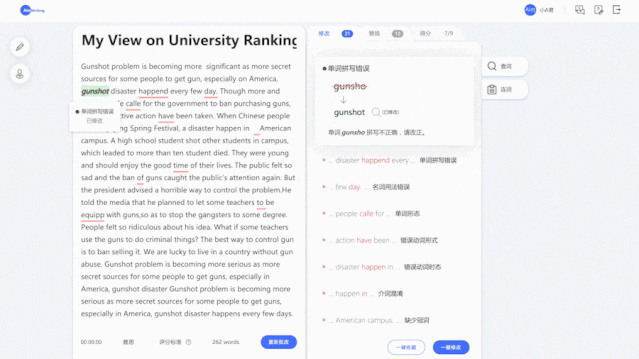 1. 完成全文的语法检查后,“爱写作”会将文中的错误用红色下划线标记出来,点击“一键修改”,所有错误一次改正。