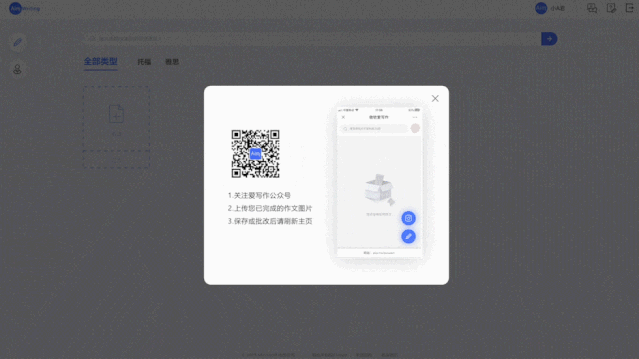 拍照录入是新版“爱写作”的一大亮点,现在的“爱写作”不仅支持本地文档和图片上传,还新增了直接拍照录入。关注“爱写作”公众号,即可将作文手写稿拍照并上传,保存或批改后刷新主页,作文手稿就会出现在页面上了。