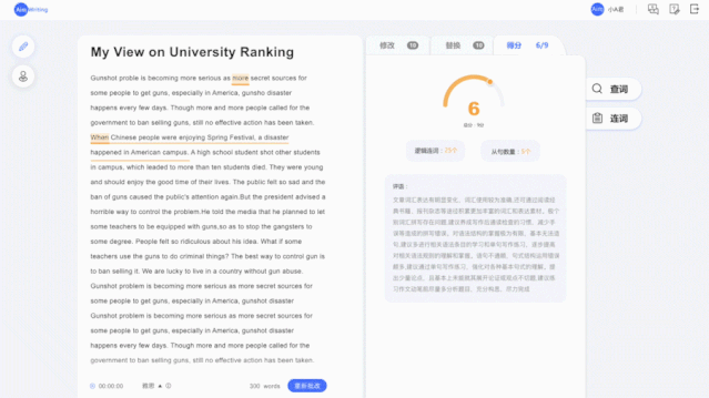 在打分功能的基础上“爱写作”又增加了更丰富的评语建议,从词汇、句子和篇章三个维度对文章进行详尽的评价,并且根据写作情况给出切实的写作建议。在词汇层面,“爱写作”会考量词汇拼写、重复程度和难度等级;在句子层面,则着重检查标点、语法和句式;在篇章层面,会分析段落和切题程度。让大家不仅能知道自己写的怎么样,还能知道接下来该怎么样提升自己的写作能力。