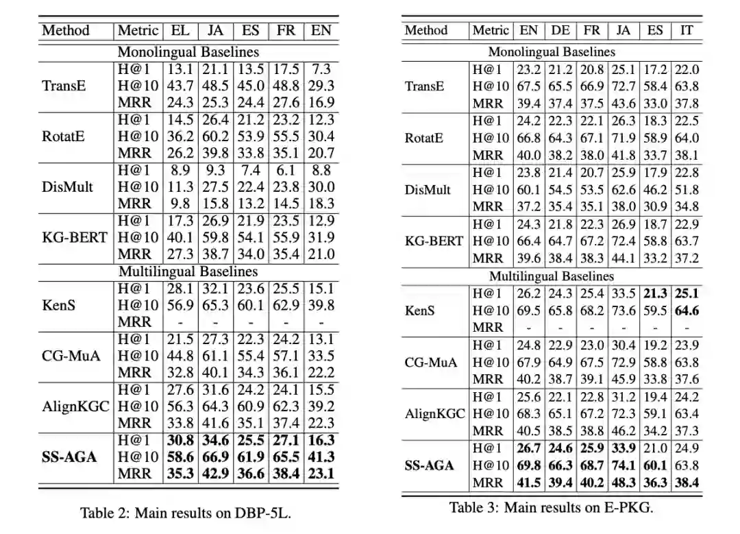 在这项工作中, 我们提出了用于多语言知识图谱补全的模型 SS-AGA。它通过融合各语言 KG 并使用关系感知注意力机制 GNN 编码器来解决多语言KG的异质性问题。通过利用自监督新实体生成器,SS-AGA 在训练过程中不断生成新的实体对从而缓解了seed alignment 的稀疏性问题。最后,我们开源了一个新的多语言电子商务产品 KG 数据集 -E-PKG,并在两个真实数据集上验证了 SS-AGA 的有效性。