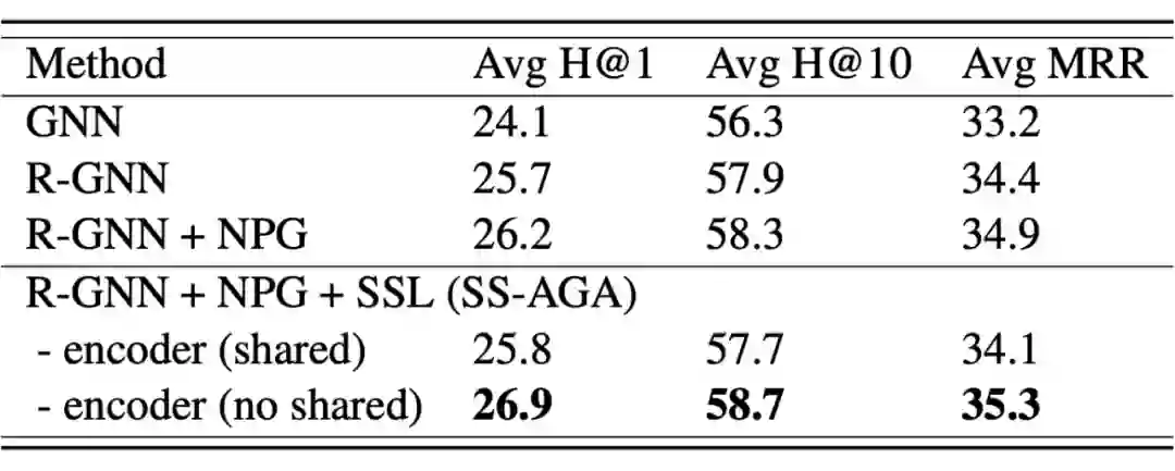 我们在 DBP-5L 上依次移除了 SS-AGA 中 GNN 编码器中的关系感知机制,新对齐实体生成器,新对齐实体生成器的自监督学习过程,以及共享用于生成器和知识图谱表征学习的 GNN 编码器参数,来进行消融实验。从下表中可以看出,不同模块的设计均对 SS-AGA 的整体效果有所提升。