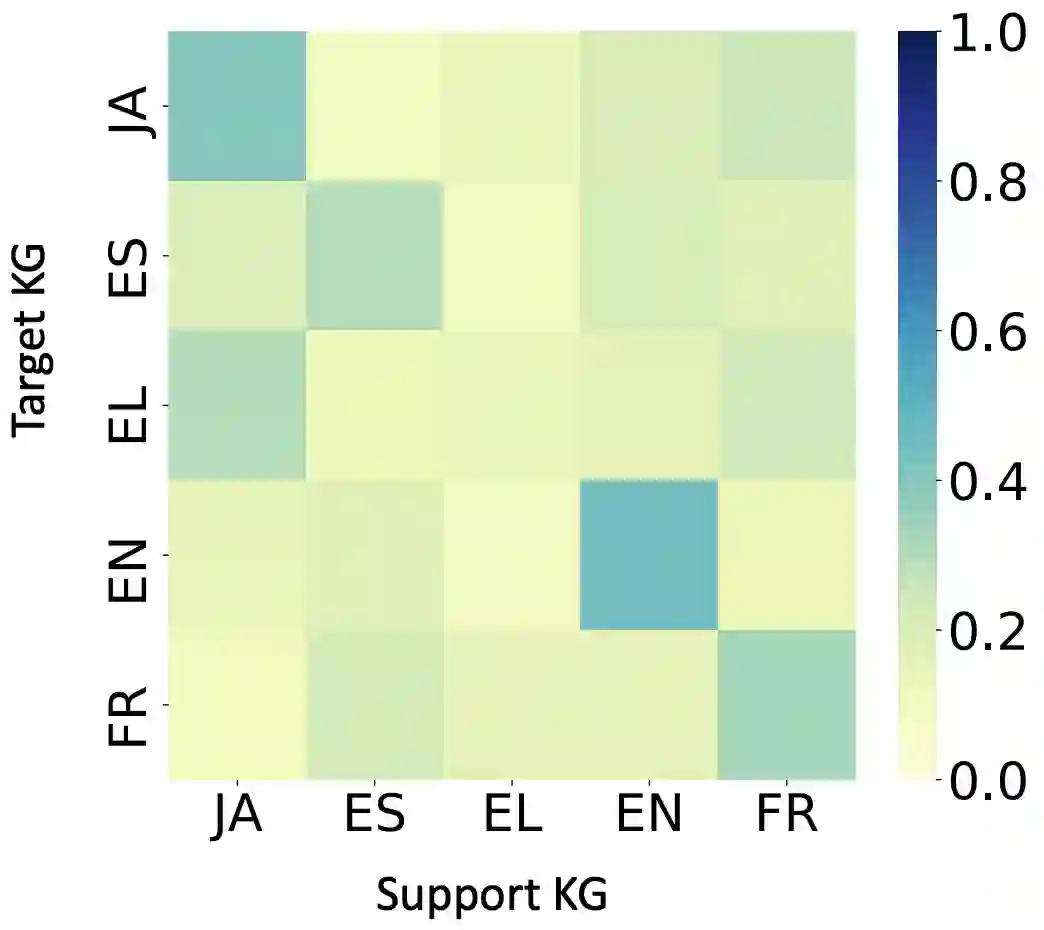 最后,我们可视化 GNN 编码器中学到的来自不同 KG 的平均注意力权重。对于完整性较高的 KG 例如英语 KG,它们最大的权重来自于本身,而对于完备性较低的希腊 KG,较高的权重值来自于其他语言的 KG。这表明希腊 KG 上的性能提升很大程度来源于其他 KG 里有效的知识传播。