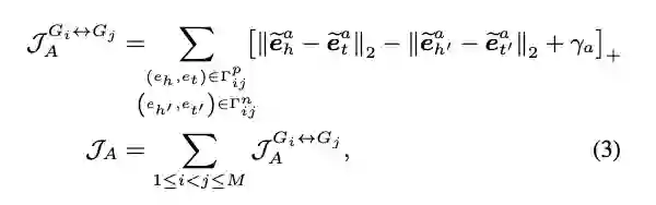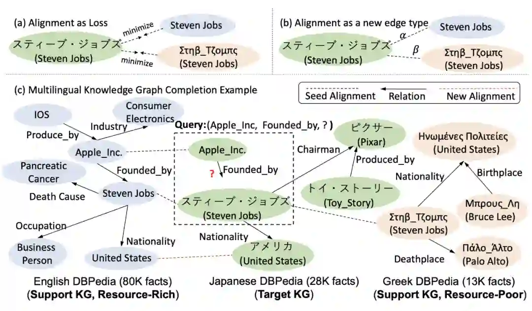 为了补全日语 KG 中(Apple Inc., 成立, ?)这一三元组,我们可以通过 Steven Jobs 这一对齐实体从英语 KG 中传递相比于希腊 KG 更多的知识。但是,如果粗暴地利用同一损失函数推动日文中的 Steven Jobs 与英语 KG 和希腊 KG 中的 Steven Jobs 同样接近,则日文中的 Steven Jobs 将接收到来自英语和希腊 KG 中对齐实体相同程度的影响。这样学习到的向量表征,可能带来其他 KG 中蕴含的无关的信息从而导致模型预测出错。