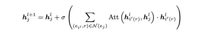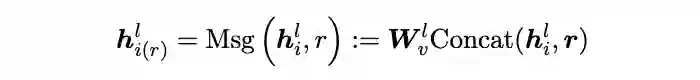 首先,我们设计一个关系感知注意机制的 GNN 编码器来同时学习所有 KG 的向量表征。我们将实体对齐视为一种新的边类型从而把所有 KG 联合成一张大图,通过学习到的注意力权重来区分来自不同 KG 的对齐实体所传播的影响。具体的关系感知注意力机制如下:
