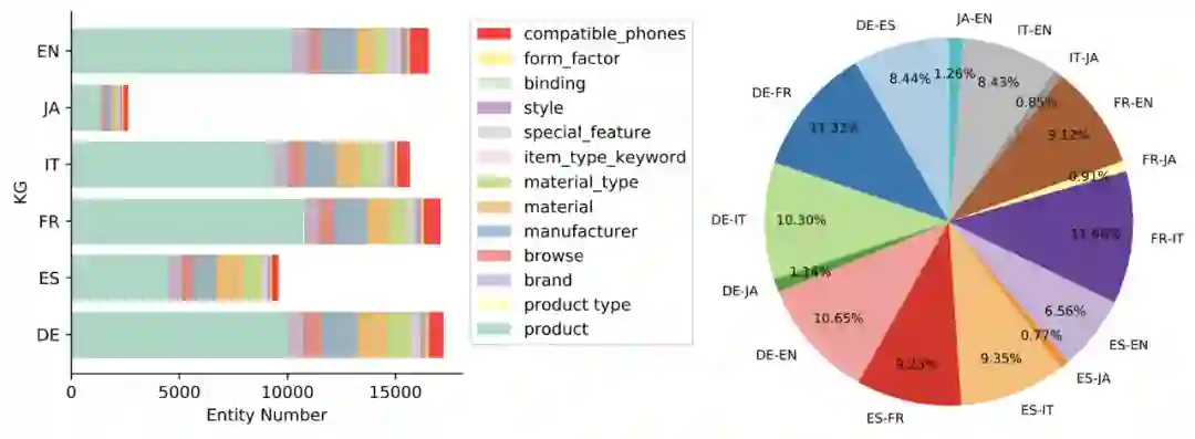 我们在两个真实世界数据集上进行了实验。除了蕴含 5 种语言的 dbpedia 数据集(DBP-5L),我们额外开源了一个多语言电子商务产品 KG 数据集 -E-PKG. 它包含与手机相关的产品信息和 6 种语言:English(EN),German(DE),French(FR),Japanese(JA),Spanish(ES),Italian(IT)。下图是 E-PKG 中各语言 KG 的实体分布图和 seed alignmen 比例图。更多细节可以在论文的附页中找到。