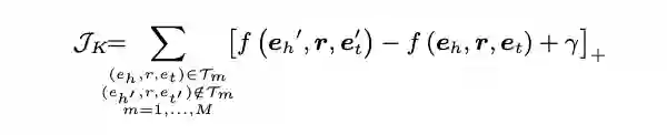 随后,我们利用知识图谱解码器(例如 TransE, RotateE)基于学习到的 KG 向量表征,来计算三元组的分数,从而进行预测。在训练过程中,我们利用如下的损失函数:
