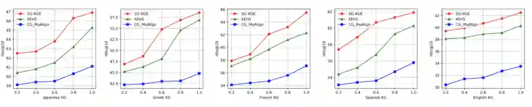 我们改变 KG 中 seed alignment 的数量来研究各个多 KG 模型对 seed alignmen 数量的灵敏度。如下图所示,当 seed alignment 数量减少时,所有模型的准确度均有下降,这验证了 seed alignment 对于多 KG 知识传播的重要性。其次,完整性低的 KG 例如 Greek KG 在 seed alignment 数量减少时,补全准确率相比其他 KG 有着更显著的下降。这说明多 KG 之间的知识传播对完整性低的 KG 有更大的帮助。最后,SS-AGA 在稀疏 seed alignment 情况下,能产生比其他多 KG 基线模型更高的准确率。