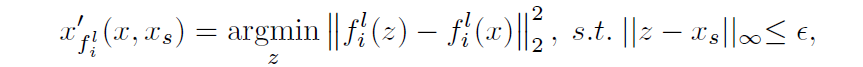 通过在x_s附近小范围内扰动其像素值得到带噪声图片z,逐步缩小z与x在隐含层特征上的差异,最终得到优化结果x'。