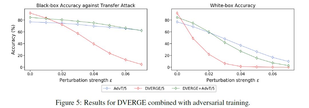 上图展示了DVERGE与对抗性训练相结合的结果,可以看出,结合后的模型体现出了由于对抗性训练模型的准确率,并在黑盒攻击与强度相对较小的白盒攻击下均显示出更高的鲁棒性。