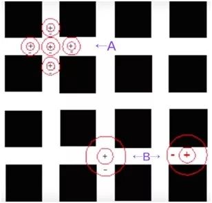 这幅图是对侧抑制理论的解释。A是视觉中央,B则处于视觉边缘。A处分配的细胞多,每个细胞负责范围小,明暗信息更准确,而B处细胞少、范围大,相比非交叉点,交叉点处细胞接收到的区域黑色较少,因此明暗对比不足,白色看起来也就不那么亮了。