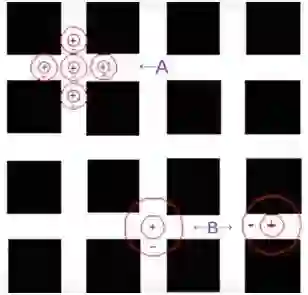 在白底灰色线条的图片上,交叉处的小黑点也破坏了线条的连续性,降低了方向性OFF细胞的激活程度,这导致了“暗程度”感知的下降。于是,黑点在灰背景中变得不明显,仿佛“消失”了一样。