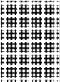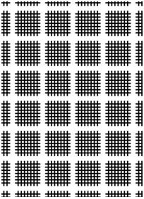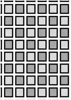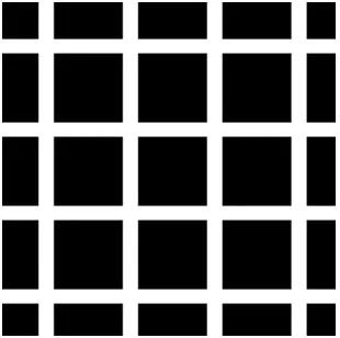 最初的栅格错觉是由卢迪马尔·赫尔曼(Ludimar Hermann)在1870年发现并报告的,取名为赫尔曼栅格错觉(Hermann Grid Illusion)[2]。最初的赫尔曼栅格图案相当简单:黑色的方块整齐排列,中间空出了垂直相交的白色条纹。而在观察这幅图的时候,观看者却总会觉得余光所及之处,白色交叉点上存在着暗点,而只要视线中心转移到那里,“暗点”就会消失,仿佛永远都追逐不到。
