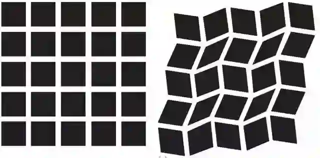 而如果把黑方块的四边的直线条全换成波浪形,错觉则会完全消失: