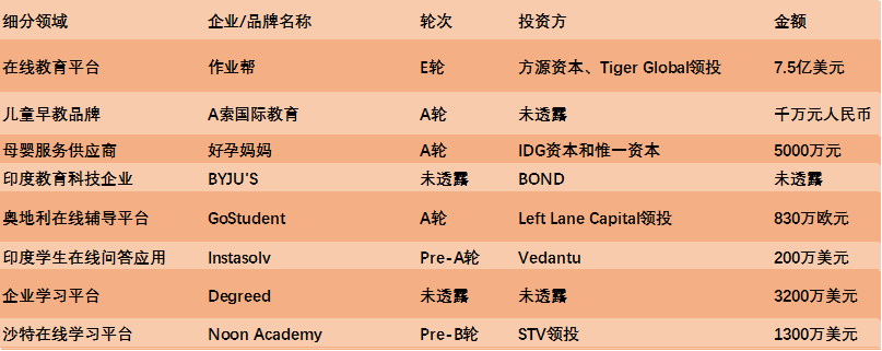 资本市场依旧热闹,作业帮完成E轮7.5亿美元融资;儿童早教品牌A索国际教育完成千万级A轮融资。