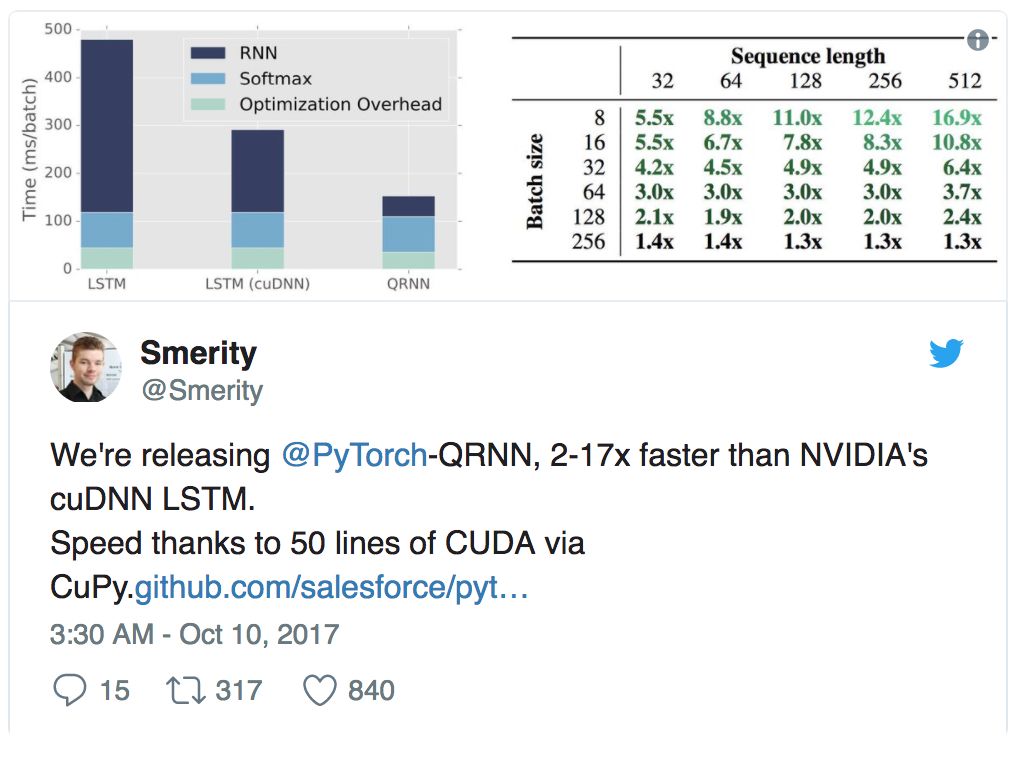 Salesforce发布了若干个工具包,包括其亮点成果PyTorch-QRNN,这是一种新型RNN,相比于CuDNN优化的标准LSTM可提速2到17倍。James Bradbury及其团队是PyTorch社区中最活跃和最有吸引力的团队之一。