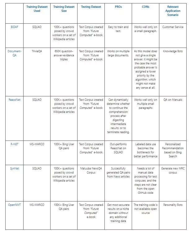 为了比较研究,我们想要在不同的数据集上训练不同的MRC模型,并在单个大型语料库上测试它们。为了达到本博文的目的,我们使用六种MRC模型方法 - BIDAF,DOCQA,ReasoNet,R-NET,SynNet和OpenNMT - 使用训练好的MRC模型为大语料库创建QA-Bot,然后比较结果。