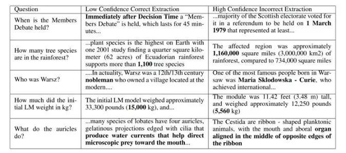 但是,由于Document-QA没有给出单个答案,因此算法可能会将最可能的答案指定为较低的优先级,这可能根本没有任何意义。我们假设,如果模型只能看到包含答案的段落,那么它可能会对启发式或模式过于自信,这种模型只有在先验知道存在答案时才有效。例如,在下面的表2中(根据论文进行调整),我们观察到,即使问题单词与上下文不匹配,模型也会为与答案类别强烈匹配的跨度分配高信度值。如果有答案,这可能会工作得很好,但在其他情况下可能不会有这么好的效果。
