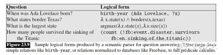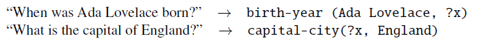在第二个范例中,基于知识的问题回答,系统构建查询的语义表示,映射“What states border Texas?逻辑表示为:或者When was Ada Lovelace born?到间隙关系:birth-year (Ada Lovelace, ?x).。然后,使用这些含义表示来查询事实数据库。