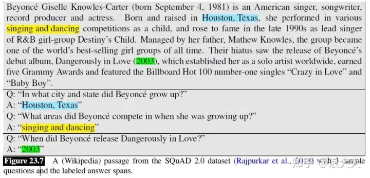 现代阅读理解系统倾向于使用专门为NLP设计的问题集合,因此对于训练监督学习系统来说足够大。例如,斯坦福问答数据集由来自维基百科的文章和答案跨越文章的相关问题组成,以及一些设计为无法回答的问题(Rajpurkar et al. 2016, Rajpurkar et al. 2018);总共有超过15万个问题。图23.7显示了一个摘自SQUAD 2.0文章的摘要,以及三个问题和它们的答案span。