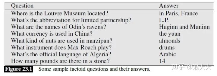 基于信息检索的问题回答的目的是通过在web或其他文档集合中查找短文本段来回答用户的问题。图23.1显示了一些示例的factoid问题及其答案