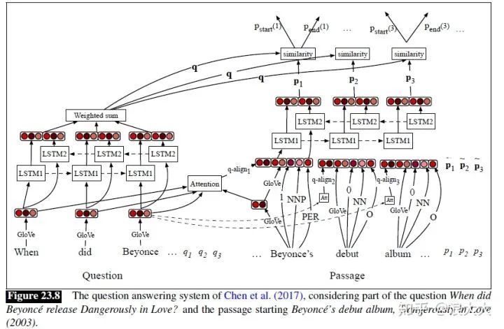 图23.8为Chen等人(2017)的DrQA系统的文档阅读器组件架构。像大多数这样的系统一样,DrQA为问题构建一个嵌入,为文章中的每个标记构建一个嵌入,计算上下文中问题和每个文章单词之间的相似性函数,然后使用问题-文章相似性评分来决定答案跨度的起点和终点。