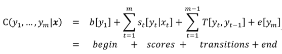 b[y_1]表示序列首位是标签 y1 的 score; e[y_m]表示序列末位是标签 y_m 的 score, 表示当前 word 标签为 y 的情况下的 score,表示前后标签状态转换的 score。