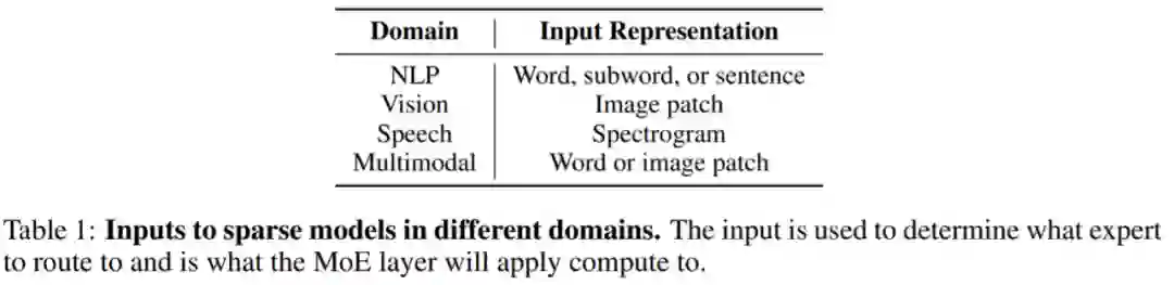 扩展专家层的数量、大小和频率 有几个重要的超参数控制着稀疏专家模型的扩展,包括:1)专家数量,2)每个专家的大小,以及 3)专家层的频率。这些决策可能对上游和下游扩展产生重大影响。 许多早期的工作扩展到每层数千个相对较小的专家,从而产生了出色的预训练和翻译质量(Shazeer et al., 2017; Lepikhin et al., 2020; Fedus et al., 2021)。然而,稀疏模型的质量在域偏移(Artetxe et al., 2021)或对不同任务分布进行微调(Fedus et al., 2021)时不成比例地降低。为了使计算和参数获得更好的平衡,用于小样本推理 (GLaM (Du et al., 2021)) 和微调 (ST-MoE (Zoph et al., 2022)) 的 SOTA 稀疏模型最多仅能使用 64 个更大的专家。由于专家维度的增加,这些模型需要有针对加速器的特定系统级分片策略才能有效运行(Du et al., 2021; Rajbhandari et al., 2022)。 路由算法 路由算法是所有稀疏专家架构的关键特性,它决定了将样本发送到哪里。该领域已被广泛研究,包括使用固定的、非学习路由模式的反直觉方法(Roller et al., 2021)。由于要对选择哪些专家做出离散决策,因此路由决策通常是不可微的。 专家选择问题后来被重新定义为 Bandit 问题,并且已有一些工作使用强化学习来学习专家选择(Bengio et al., 2016; Rosenbaum et al., 2017; 2019; Clark et al., 2022)。Shazeer et al. (2017) 提出了一种可微的启发式算法,以避开强化学习的难点。 该论文详细阐述了路由算法的分类,并进一步说明了该领域的关键问题——负载均衡。 稀疏专家模型的迅速发展 稀疏专家模型的影响正在迅速蔓延到NLP以外的其他领域,包括计算机视觉、语音识别和多模态应用。尽管领域不同,但模型的架构和算法大致相同,下表 1 显示了不同域的稀疏层输入表征。