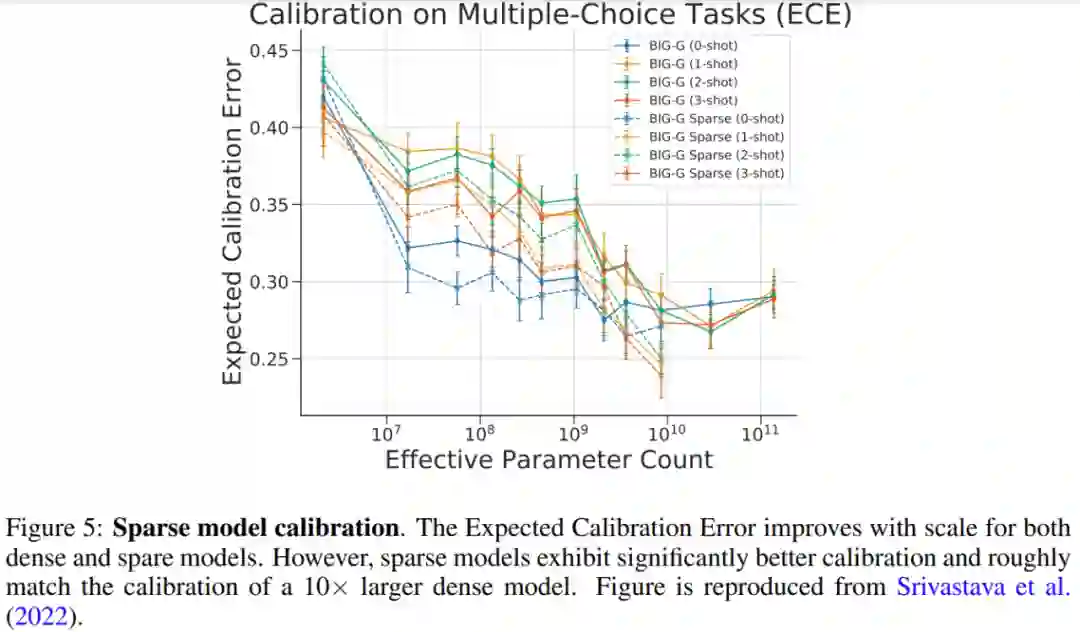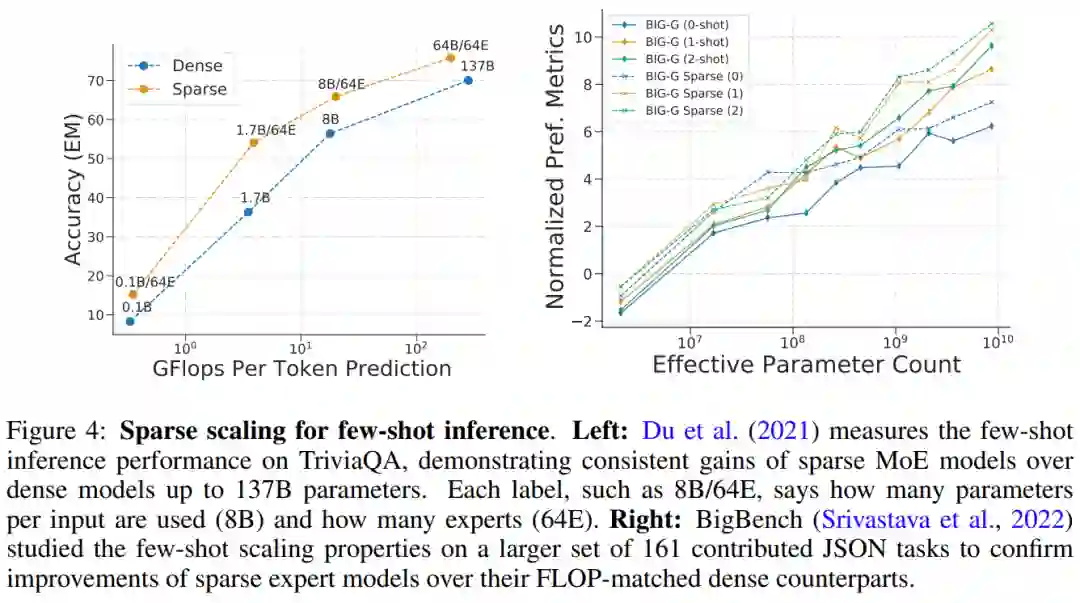 硬件 现代稀疏专家模型已与用于训练最大神经网络的分布式系统共同设计。 大型神经网络(Brown et al., 2020; Rae et al., 2021; Chowdhery et al., 2022)的研究表明神经网络已经远远超过单个加速器的内存容量,因此权重,激活函数,优化器变量等张量需要使用各种并行策略分片。 三种常见的并行方法包括:数据并行(复制模型权重,对数据进行分片)、张量模型并行(数据和权重张量跨设备分片)和 pipeline 并行(整个层或层组被跨设备分片),混合专家模型通常能够适应这些并行方案。 在MoE 模型的训练和部署方面,Jaszczur et al. (2021)将 Transformer 模型的所有层进行稀疏化,从而实现了 37 倍的推理加速;Kossmann et al. (2022)通过 RECOMPILE 库解决了静态专家批处理大小的约束问题。 除了数据并行、模型并行和专家并行外,Rajbhandari et al.(2022) 提出 DeepSpeed-MoE 库,以支持 ZeRO partitioning 和 ZeRO-Offload,实现了 10 倍推理提升和 SOTA 翻译性能,从而增加了模型在生产服务中的实用性。 稀疏专家模型的扩展特性 密集神经语言模型的交叉熵损失表现为一种关于模型参数计数、数据量和计算预算(Kaplan et al., 2020)的幂律。幂律系数后来在 Hoffmann et al. (2022)中得到纠正,这表明计算最优模型需要数据和参数扩展更紧密的平衡。相比之下,稀疏专家模型的早期研究以启发式方式扩展获得了强有力的实证结果,但没有仔细描述扩展定律。此外,一些工作强调了上游(例如预训练)和下游(例如微调)行为之间的差异(Fedus et al., 2021; Artetxe et al., 2021),进一步复杂化了对稀疏专家模型的理解。 上游扩展 稀疏专家模型在大型数据集上训练时表现出色。自然语言处理中的常见模式是先执行上游训练(例如预训练),然后对特定感兴趣的数据分布进行下游训练(例如微调)。在上游阶段,稀疏专家模型一直比密集对应模型产生更高的收益。Shazeer et al. (2017) 在 10 亿字语言建模基准(Chelba et al., 2013)上提出了关于模型参数和计算预算的扩展曲线,与密集版本相比取得了显著收益。Lepikhin et al. (2020)提出了模型扩展函数的改进版本,并在其最大的 600B 参数稀疏模型上获得了 13.5 的 BLEU 分数增益。Switch Transformer (Fedus et al., 2021) 在 T5 模型上使用相同的计算资源测量到 4-7 倍的 wall-time 加速。该工作还研究了作为参数计数函数的交叉熵损失扩展,但观察到超过 256 位专家时,收益减少了。 下游扩展 然而,可靠的上游扩展并没有立即在下游任务上产生一致的收益。在一项强调迁移挑战的工作中,Fedus et al. (2021)使用低计算、高参数编码器 - 解码器 Transformer(1.6T 参数,每个稀疏层有 2048 个专家)观察到 4 倍的预训练改进,但它在 SuperGLUE 等密集型推理任务上的微调效果不佳。这一发现暗示了进一步的必要研究以及计算和参数之间可能需要的平衡。 Du et al.(2021) 展示了稀疏 GLaM 模型的扩展,范围从 1B-64B FLOP,每个稀疏层使用 64 位专家。GLaM 取得了 SOTA 结果,在 zero-shot 和 one-shot 性能方面优于 175B 参数的 GPT-3 模型(Brown et al., 2020),同时在推理时每个token使用的 FLOP 减少了 49%,功耗降低了 65% (如下图4(左)所示)。下图 4 (右) 是稀疏模型在少样本推理上表现良好的另一个例子。