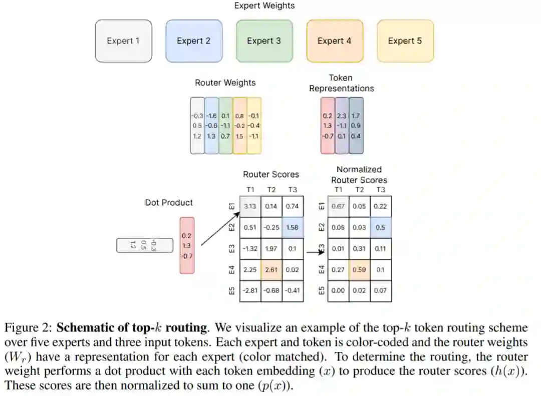 稀疏专家模型(其中,混合专家系统(MoE)是最流行的变体)是一种特殊的神经网络,其中一组参数被划分为 “专家”,每个“专家” 具有唯一的权重。 在训练和推理期间,模型将输入样本给到特定的专家权重,让每个样本仅与网络参数的子集交互,这与将整个网络用于每个输入的常规方法不同。由于每个样本仅使用一小部分专家,因此相对于总模型来说计算量大幅减小了。 许多现代稀疏专家模型从 Shazeer et al. (2017)中汲取了灵感。该研究训练了当时最大的模型,并取得了最先进的语言建模和翻译结果。与 Transformer 语言模型结合使用时,稀疏专家模型的受欢迎程度进一步飙升(Lepikhin et al., 2020; Fedus et al., 2021)。虽然大部分工作都在自然语言处理方面,但稀疏专家模型也已成功用于各种领域,包括计算机视觉(Puigcerver et al., 2020)、语音识别(You et al., 2021)和多模态学习(Mustafa et al., 2022)。Clark et al. (2022) 研究了稀疏专家模型在不同模型大小和专家数量下的扩展特性。此外,许多基准测试的最新结果目前由 ST-MoE 等稀疏专家模型持有(Zoph et al., 2022)。随着研究和工程的进步,该领域正在迅速发展。 这篇综述论文将调查范围缩小到狭义深度学习时代(从 2012 年开始)的稀疏专家模型,回顾了最近的进展并讨论了有希望的未来途径。 稀疏专家模型 机器学习中的 MoE 概念可以追溯到至少 30 年前,在早期的概念中,专家们定义了一个完整的神经网络,MoE 类似于一种集成方法。 Eigen et al. (2013) 提出在抖动(jittered)的 MNIST 上使用堆叠层专家混合架构,这项工作为后来模型的高效实现奠定了基础。 Shazeer et al. (2017)提出在两个 LSTM 层之间插入一个 MoE 层,由此产生的稀疏模型在机器翻译中实现 SOTA 性能。然而,此方法虽然取得了成功,但后续研究就像冬眠了一样,停滞不前,大部分研究都转向了 Transformer。 2020 到 2021 年间,GShard 和 Switch Transformer 发布,两者都用专家层取代了 Transformer 中的前馈层。 尽管使用一层专家层的方法已经成为主导范式,但近两年的研究重新审视了专家模型作为完全独立模型的概念,以实现模块化和可组合性。 下图 2 是 Shazeer et al. (2017) 提出的原始 top-k 路由机制,这是许多后续工作的基础。该综述论文在第四章中详细讲解了路由算法的新进展。