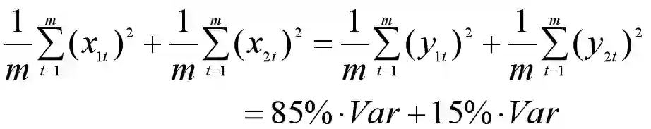 我们把向量X1和X2的元素记为x1t、x2t(t=1,2,...,m),把主成分Y1和Y2的元素记为y1t、y2t(t=1,2,...,m),那么整个数据集上的方差可以表示如下(数据早已经减去均值,所以行向量的均值为0)。