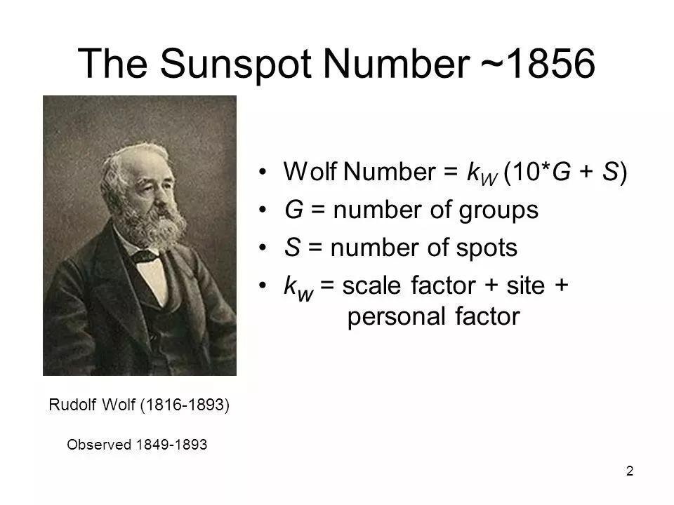 直到 1848 年,瑞士天文学家鲁道夫·沃尔夫(Rudolf Wolf)在对太阳黑子进行了系统观察之后,开发出一个计算世界范围内黑子数量(即著名的沃尔夫相对数)并沿用至今的公式,人们对太阳黑子活动才有了进一步认识。沃尔夫相对数也叫太阳黑子相对数,是测量太阳活动随时间变化的一种方法。