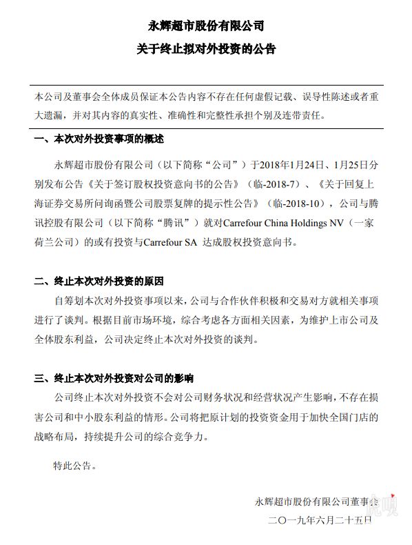 6月24日,永辉超市公告称,此前,公司与腾讯就对Carrefour China Holdings NV的或有投资与Carrefour SA 达成股权投资意向书。自筹划本次对外投资事项以来,公司与合作伙伴积极和交易对方就相关事项进行了谈判。根据目前市场环境,综合考虑各方面相关因素,为维护上市公司及全体股东利益,公司决定终止本次对外投资的谈判。