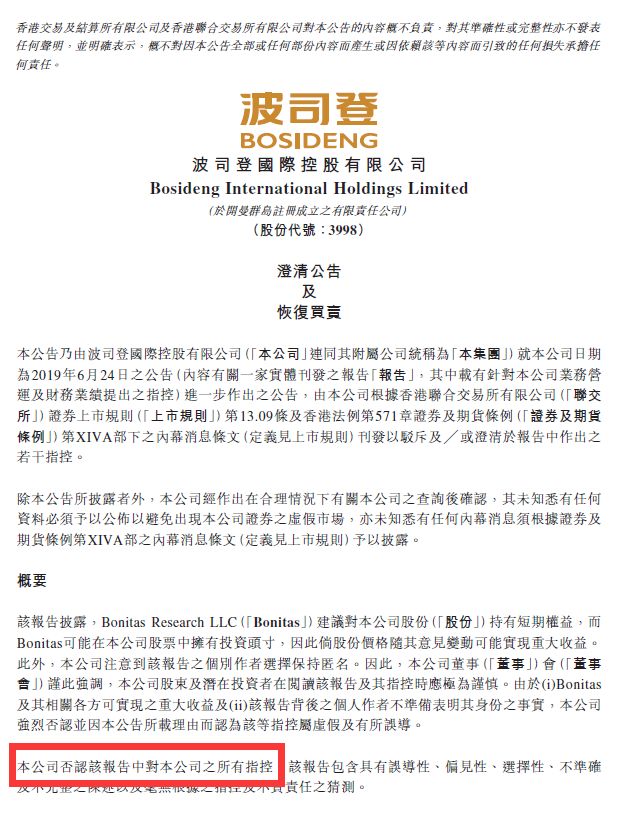6月25日,波司登在港交所发布公告,称否认Bonitas报告中对本公司的所有指控。该报告包含具有误导性、偏见性、选择性、不准确及不完整之陈述以及毫无根据之指控及不负责任之猜测。并且,公司股票将于今日上午9点恢复交易。