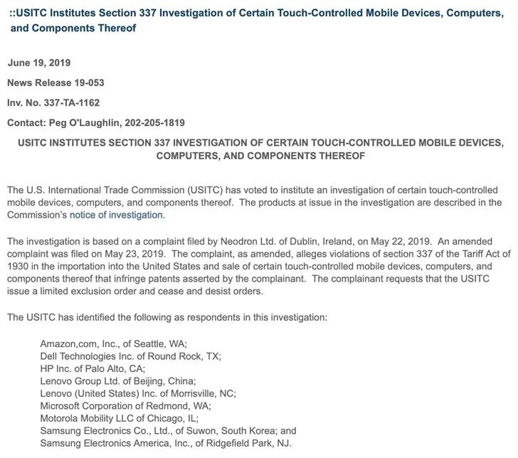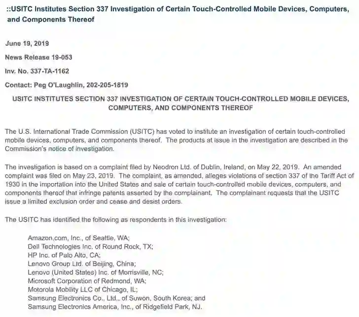 6月24日消息,总部位于爱尔兰的Neodron公司指控三星、微软、联想等7家公司侵犯其触摸屏专利,要求国国际贸易委员会(USITC)展开调查,USITC 6月19日决定对上述7家公司进行调查。美国国际贸易委员会表示,此次调查的对象包括三星电子、三星电子美国、亚马逊、戴尔、惠普、微软、摩托罗拉、联想以及联想美国。(IT之家)