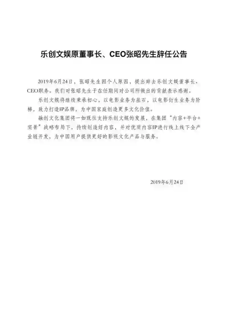 6月24日,乐视影业官方微信发布公告称,乐创文娱原董事长、CEO张昭因个人原因辞任,融创文化集团将一如既往支持乐创文娱的发展。