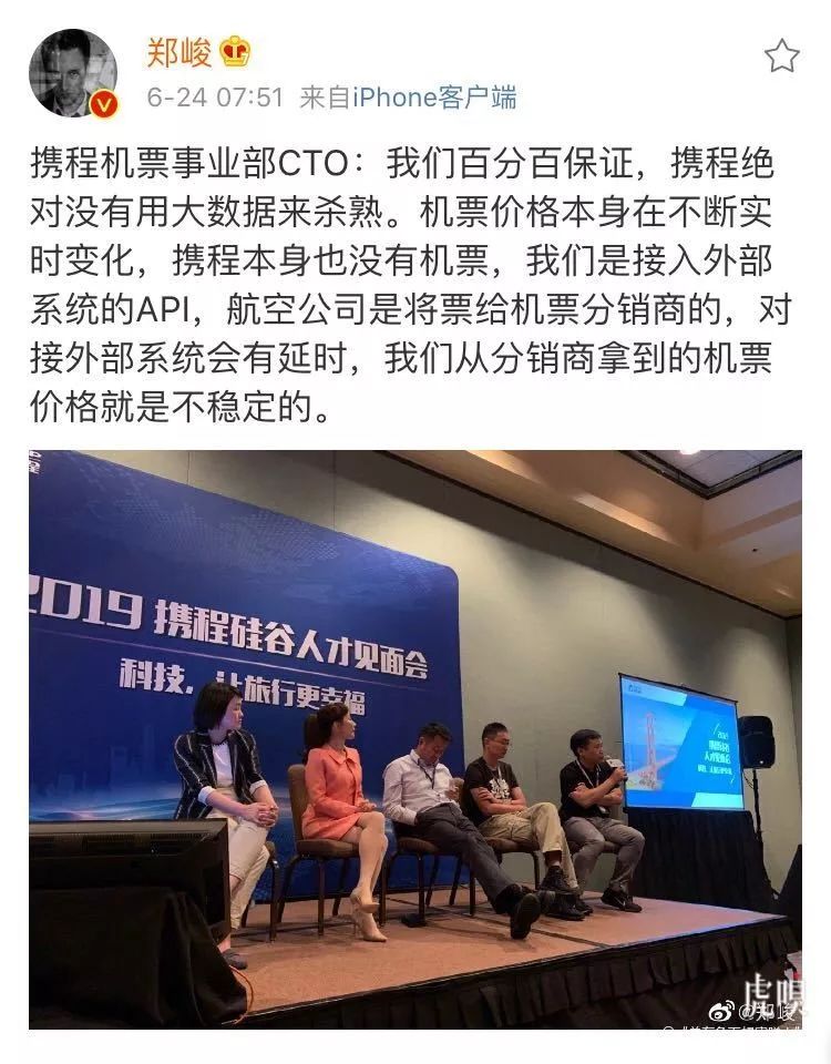 据知名科技记者@郑峻 称,在今日的携程硅谷人才见面会上,现场有人再次提到了“大数据杀熟”的问题。对此携程机票事业部CTO回应道,我们百分百保证,携程绝对没有用大数据来杀熟。机票价格本身在不断实时变化,携程本身也没有机票,我们是接入外部系统的API,航空公司是将票给机票分销商的,对接外部系统会有延时,我们从分销商拿到的机票价格就是不稳定的。