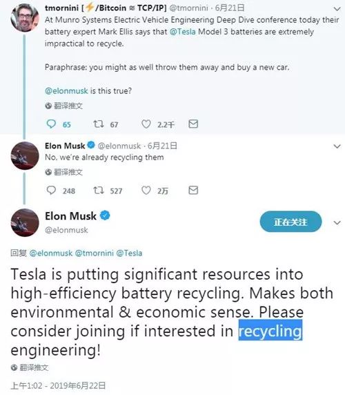 22.马斯克回应特斯拉电动汽车电池不利于回收质疑:已在回收