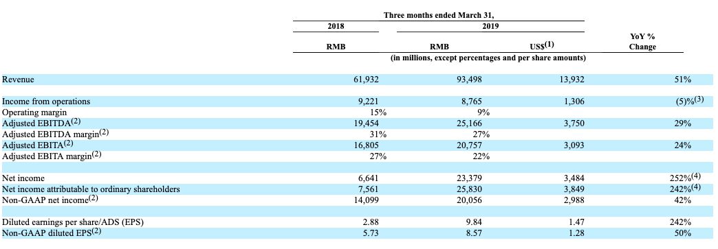财报显示,截止3月31日,按照美国通用会计准则(GAAP)计算,阿里巴巴集团2019财年收入达3768.44亿元人民币,第四财季营收为934.98亿元人民币,同比增长51%;归属于普通股股东的净利润为258.3亿元。