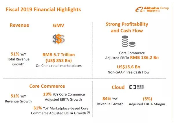 同时,2019财年全年营收的增幅也为51%,达到3768.44亿元。其中,营业利润为570.84亿元,调整后EBITDA同比增长15%至1219.43亿元。归属于普通股股东的净利润为876.00亿元,净利润为802.34亿元;不按美国通用会计准则计算,净利润为934.07亿元,同比增长12%。