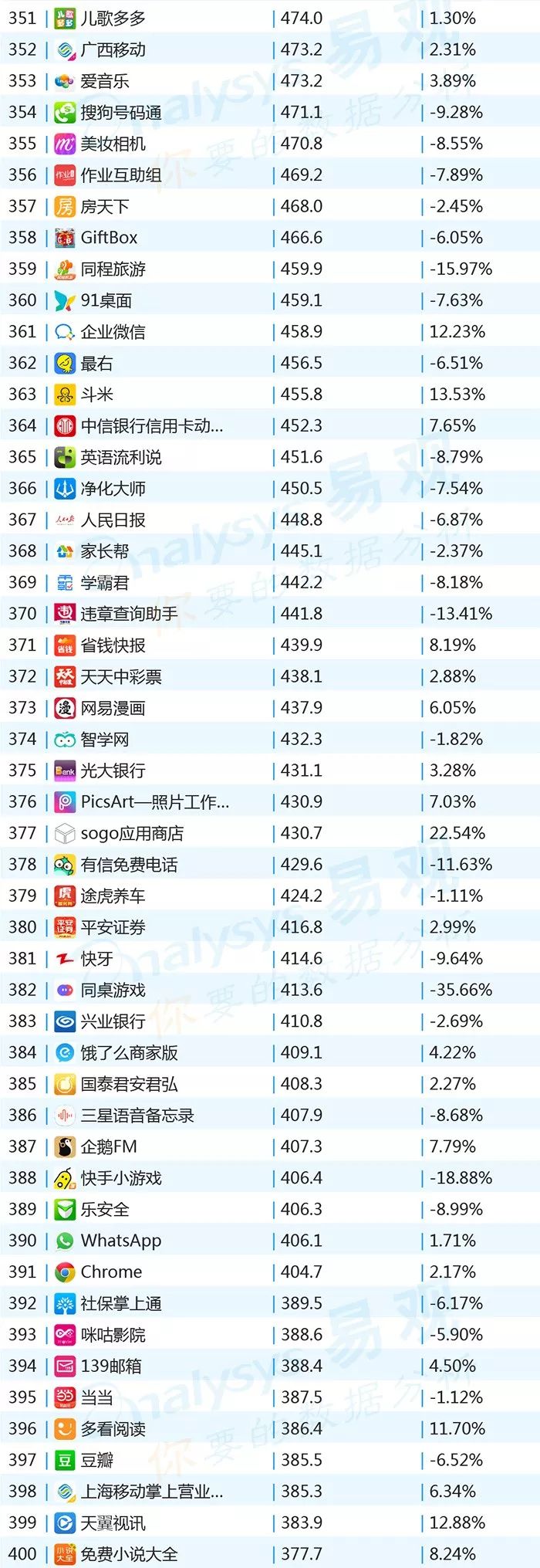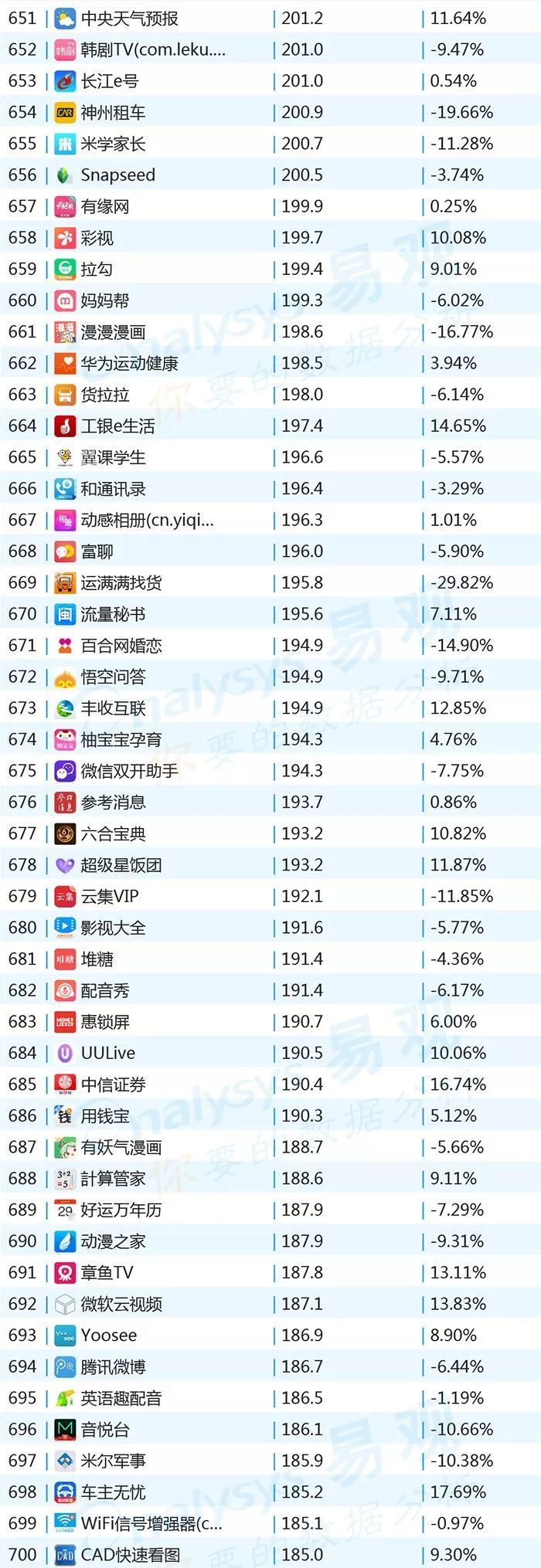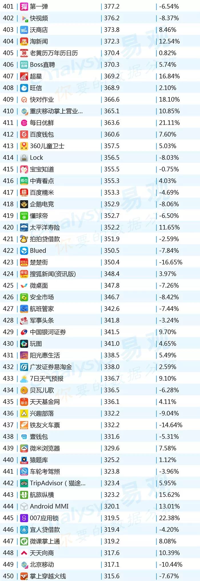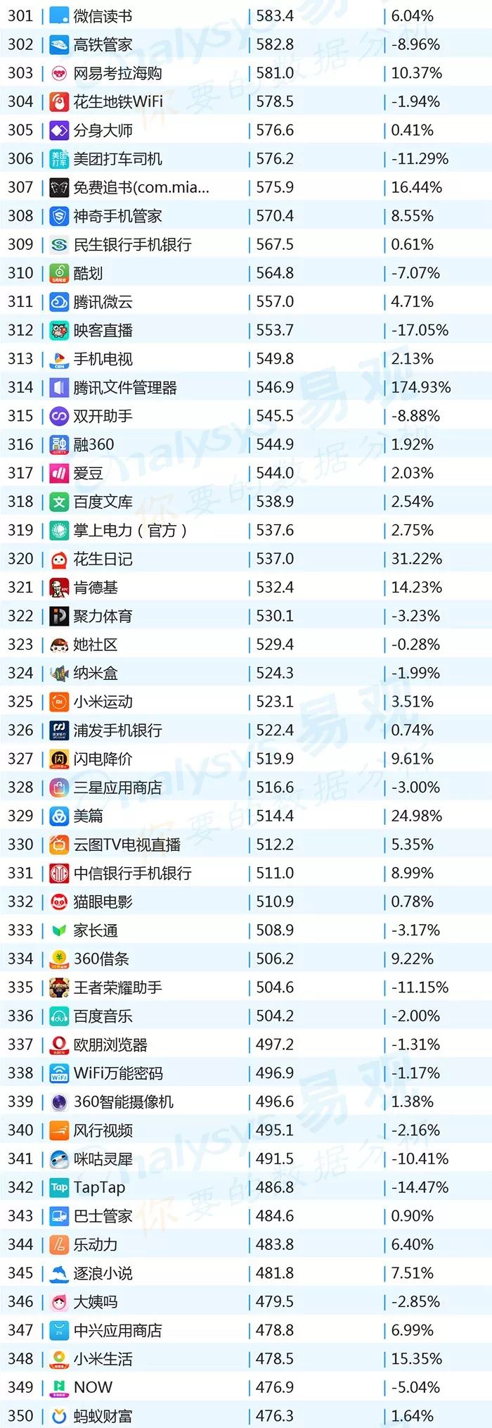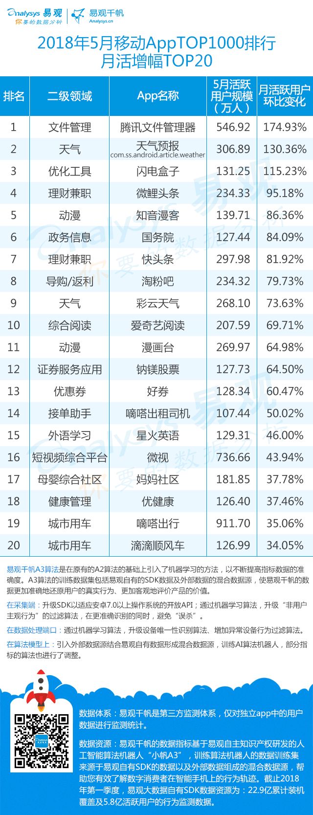 ▌增幅TOP20:上证指数上涨带动证券类用户活跃,微视联手《创造101》增势显著