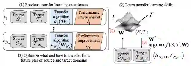 。a_e∈A = {a_1, · · · , a_Na } 表示从包含 Na 个基本算法的集合 A 中随机选择一个迁移学习算法。假定优算法 a_e 推断出来的迁移可以参数化为 W_e。最后,每一个迁移学习经验通过性能提升提升率