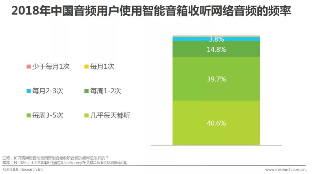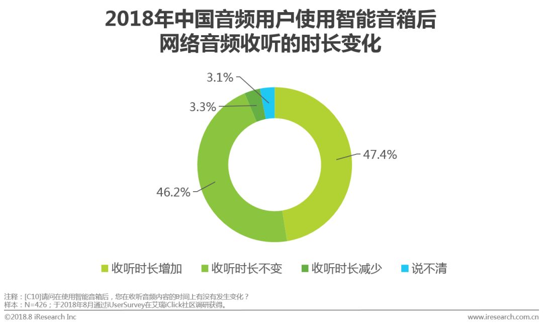根据艾瑞调研数据,40.6%拥有智能音箱的音频用户几乎每天都用智能音箱收听音频。同时智能音箱的使用对音频用户的收听时长也有一定的积极影响,47.4%的音频用户使用智能音箱后,网络音频的收听时长增加。