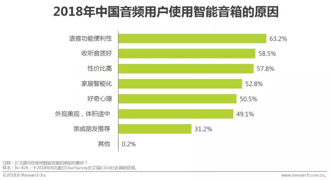 音频用户使用智能音箱主要出于语音功能便利性(63.2%)、收听音质好(58.5%)、性价比高(57.8%)等原因。