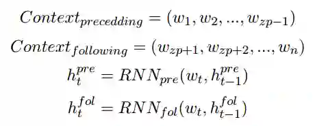 受Lin et al. (2017)的启发,我们这里利用自注意力机制来建模零代词的上下文信息。我们利用两个循环神经网络(RNN)来分别建模零代词上文和下文,然后利用这些向量进行自注意力的建模。对于一个零代词,我们将其对应的上下文信息利用RNN建模成序列词嵌入(embedding)。