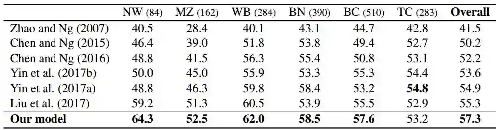 我们设置注意力矩阵的维数为2(r = 2)。从结果中,我们可以发现我们的系统得到了F值为57.3%,超过了最好的基准系统。